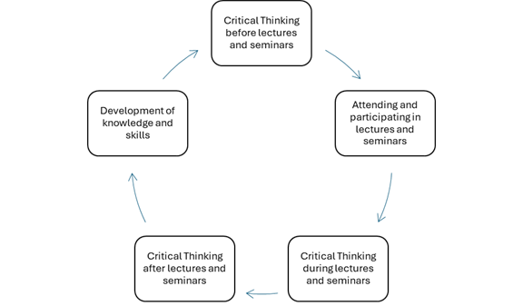 Donald Schön argued in The Reflective Practitioner (1983) that reflection can be undertaken in action and on action, and in 1991, he added reflection for action. If we replace reflection with critical thinking, we can see that critical thinking can be undertaken for action (preparation for lectures and seminars), in action (lectures and seminars) and on action (after lectures and seminars): an experiential learning loop, as illustrated below. This demonstrates the importance of continual critical thinking. It is not an isolated or silo-ed activity, but instead critical thinking should be undertaken by students before, during and after learning activities.